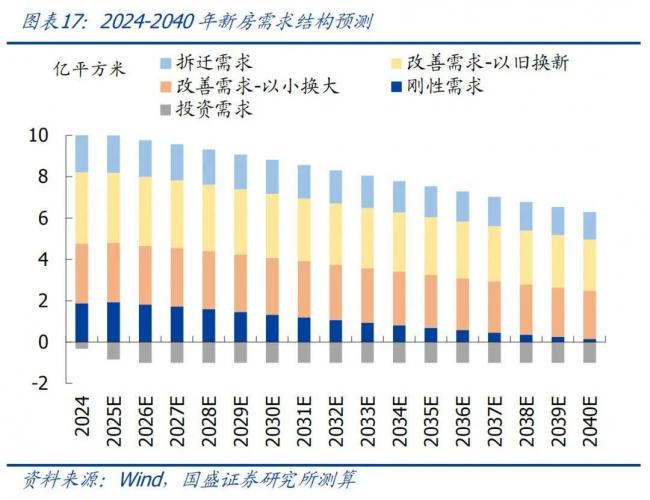 国盛证券指出,近年来房地产逐渐调整,居民购房意愿明显下降,2024-2040年新房投资需求已经为0、甚至为负。也即前期出于投资性需求购房的多套房家庭,在下行期出售多余房产。