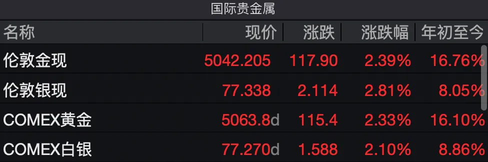 国际贵金属期货周五同样普遍收涨,Wind数据显示,COMEX黄金期货涨2.33%,报5063.80美元/盎司,本周累计上涨1.51%;COMEX白银期货,涨2.10%报77.27美元/盎司,本周累计下跌0.33%。黄金价格在经历史诗级暴跌后,已连续第二周价格回升,但白银价格仍在持续下行。
