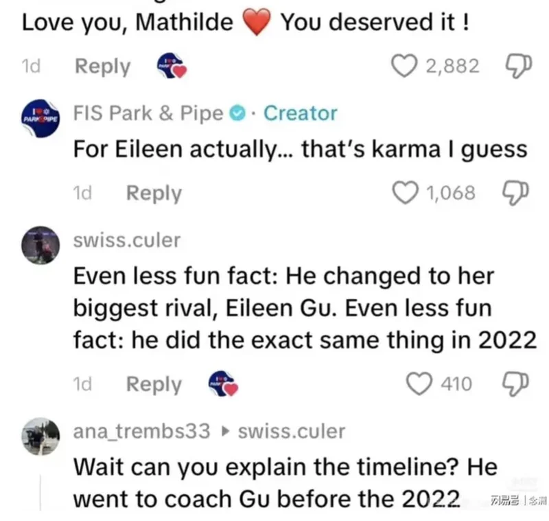 另一个瑞士网友留言道:“更冷的知识:他转去执教她最大的对手谷爱凌了。更冷的知识:他在2022年也干了一模一样的事。”