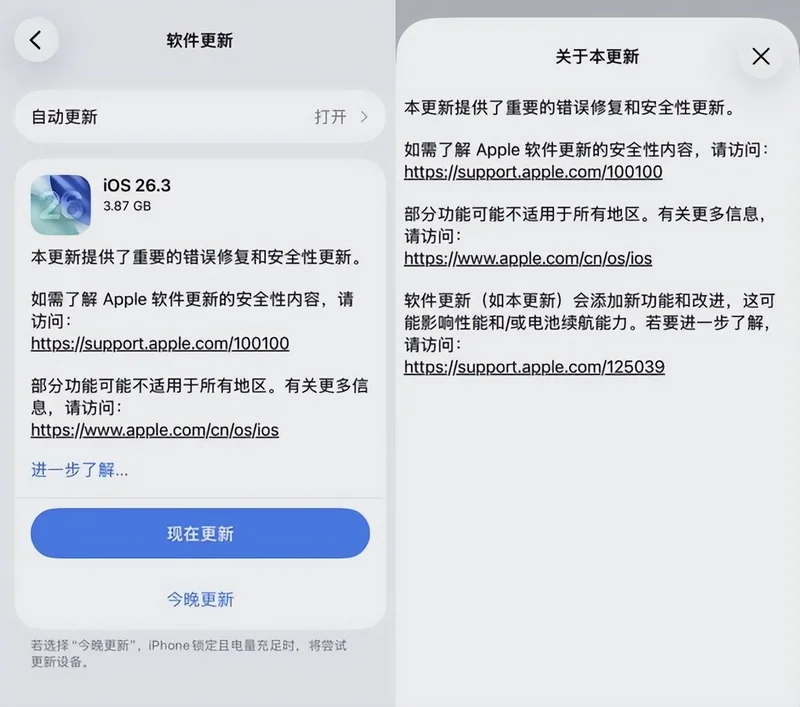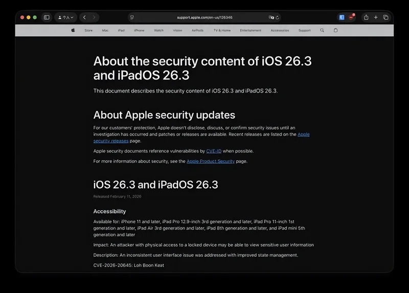 虽然可见新功能不多,但这次iOS 26.3的核心亮点,其实是安全修复,苹果官方文档显示,本次iOS/iPadOS 26.3共修复了多达37项安全问题。