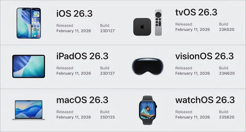 苹果iOS 26.3正式版突然悄咪咪开启推送了,顺带还打包了iPadOS、macOS、watchOS等一系列26.3版本,主打一个全家桶式更新。