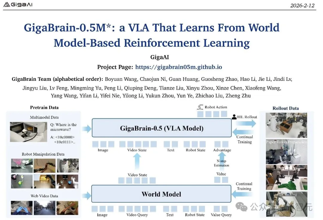 极佳视界具身大模型 GigaBrain-0.5M*,以世界模型预测未来状态驱动机器人决策,并实现了持续自我进化,超越 π*0.6 实现 SOTA!该模型在叠衣、冲咖啡、折纸盒等真实任务中实现接近 100% 成功率;相比主流基线方法任务成功率提升近 30%;基于超万小时数据训练,其中六成由自研世界模型高保真合成。
