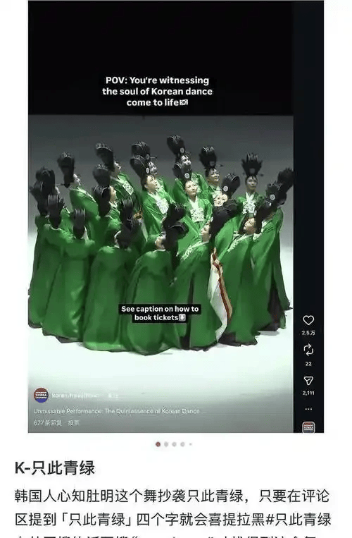可这次韩国舞蹈团的《佾舞》获奖,直接让奖项口碑翻车 —— 明眼人都能看出,作品不仅照搬《只此青绿》的青绿主色调、标志性的 “青绿腰” 等动作,东拼西凑的模仿毫无艺术韵味,只剩粗糙的表面复刻。