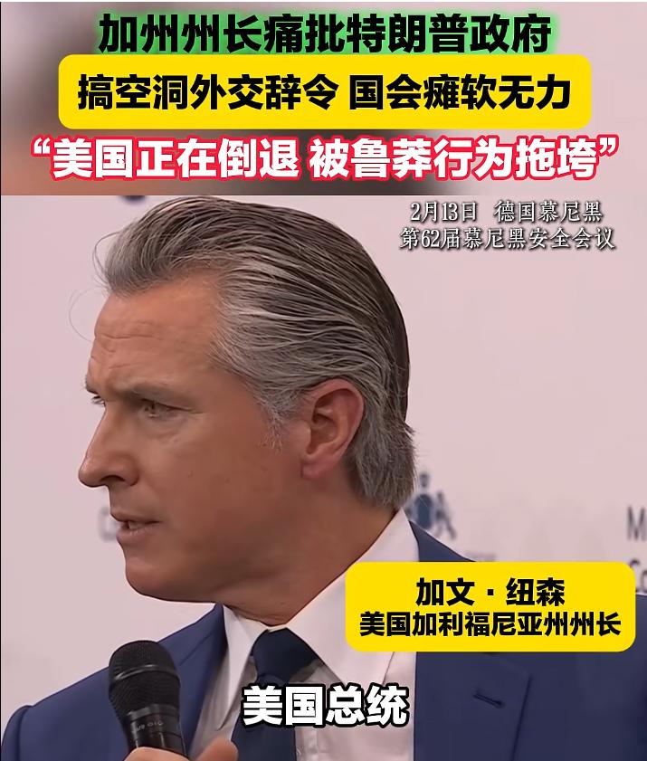 当地时间2月13日,美国加利福尼亚州州长加文·纽森在出席第62届慕尼黑安全会议时痛批特朗普(专题)政府,直言“美国正在倒退”,并呼吁企业领袖和民众“必须站出来”。