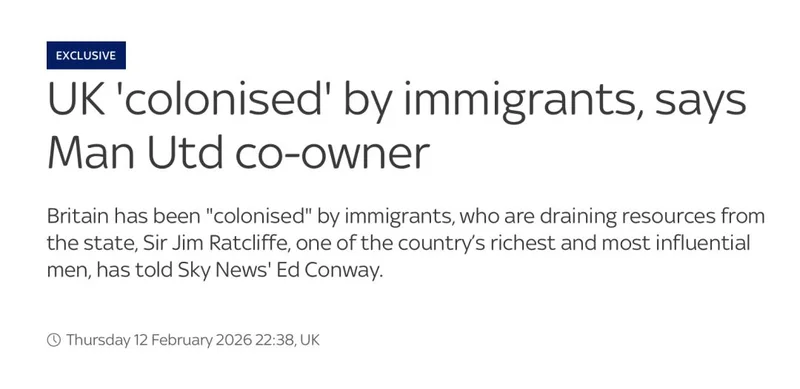 两天前(2月11日),英超豪门曼联的联合控股人、全球知名大型化学品及能源公司英力士集团(Ineos)的创始人兼董事长吉姆·拉特克利夫(Sir Jim Ratcliffe)在接受天空新闻采访时说:“英国已经被移民殖民了,政界人士应该拿出勇气,采取一些不受欢迎的措施,着手解决移民、福利依赖和经济疲软等问题。”