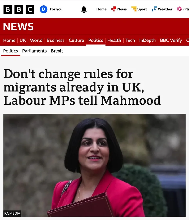 BBC最新消息:数十名议员致信内政大臣马哈茂德,呼吁“让移民等待更长年限才能获得英国永久居留权”的改革计划不要涉及已经身在英国的移民。