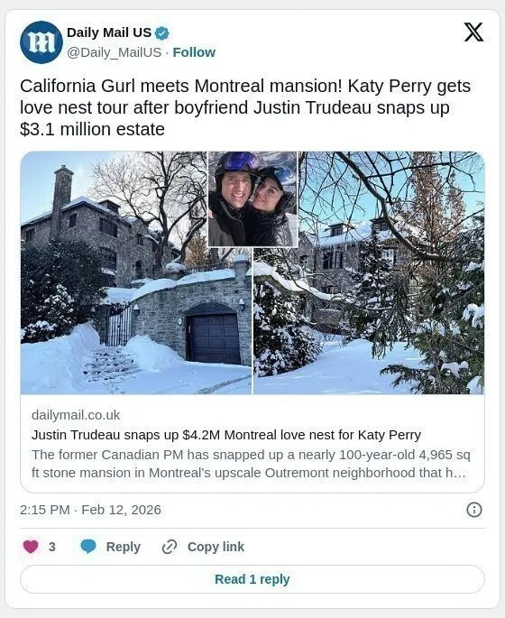 据《每日邮报》(Daily Mail)披露,贾斯汀·特鲁多(Justin Trudeau)正逐步适应卸任总理后的生活,与流行天后“水果姐”Katy Perry相伴左右,同时购入一座价值400多万加元的豪宅。