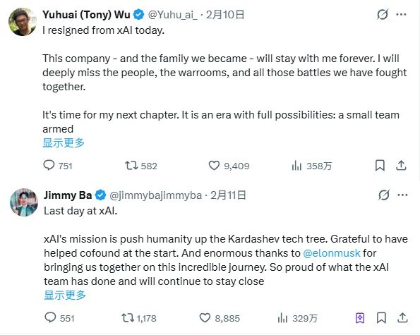 综合外媒报道,2月10日到11日期间, xAI两名华人创始人—— 吴宇怀(Tony Wu)和吉米·巴(Jimmy Ba)先后对外宣布离职。这意味着短短一个月内,xAI已经损失3名华人联合创始人。