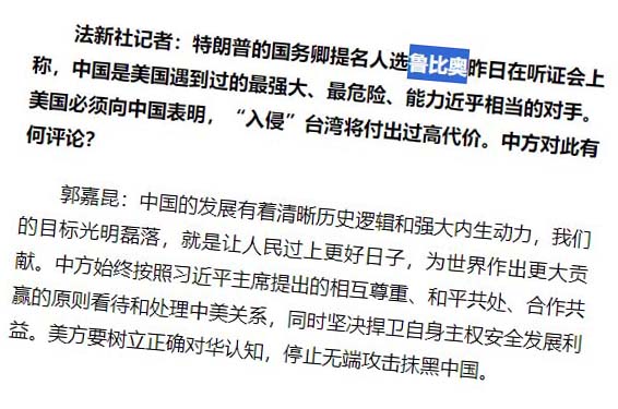 2025年1月16日,中共外交部官网将美国国务卿提名人选的名字翻译成“鲁比奥”。(网页截图)