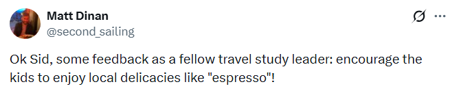 还网友补充道:“Sid,带队出国其实可以让孩子们多尝尝当地美食,比如一杯espresso!”
