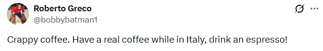 另一位网友表示:“意大利肯定有更好的咖啡吧。”