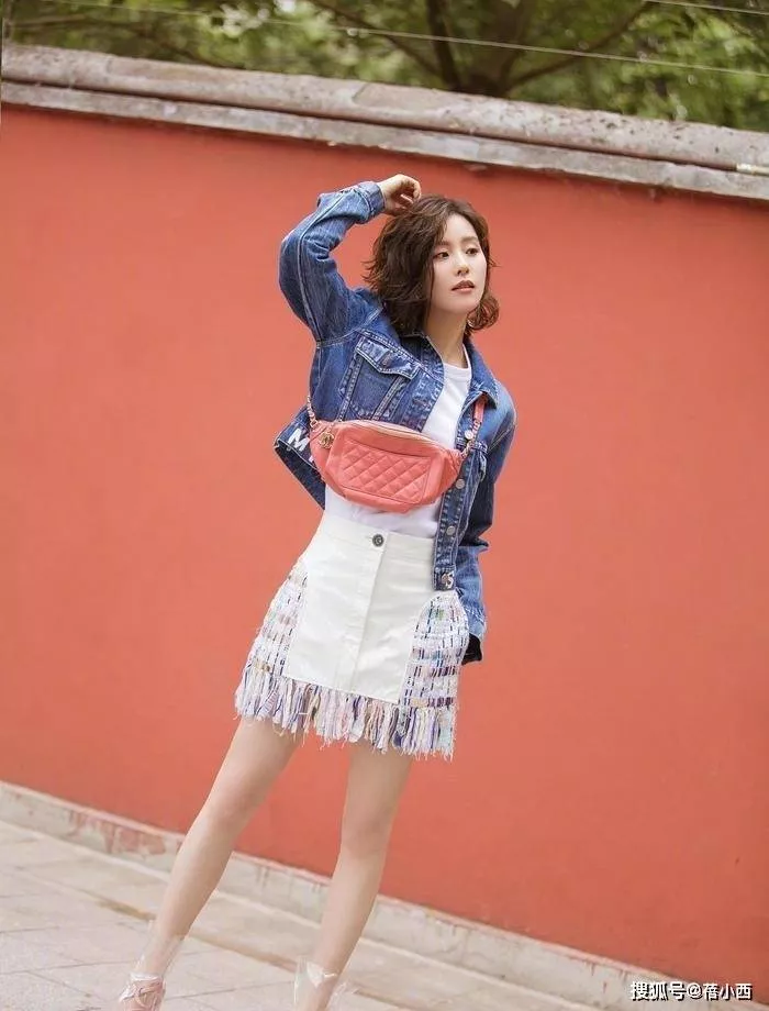 白色短裙的搭配充满少女感,裙身主体采用简约的白色皮质面料,自带细腻光泽感,而裙摆处拼接的彩色流苏边则瞬间注入了活力气息,细碎的流苏随着动作轻轻晃动,让静态的穿搭多了几分灵动俏皮,短裙的长度恰好露出纤细的小腿,在视觉上拉长了腿部比例,配合刘诗诗笔直的腿型,更显轻盈高挑。白与蓝的经典配色干净利落,流苏的色彩点缀则打破了基础款的单调,让整体造型在简约中透着巧思。