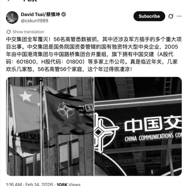 2月14日,海外知名自媒体人蔡慎坤先生在X平台爆料,“中交集团全军覆灭!56名高管悉数被抓,其中还涉及军方插手的多个重大项目出事。”