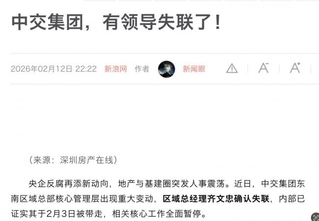 2月12日,大陆新浪网刊发一篇文章《中交集团,有领导失联了!》。文章称,据内部多位人士证实,中交集团东南区域总部核心管理层出现重大变动,区域总经理齐文忠确认失联,内部已证实其于2月3日被带走,相关核心工作全面暂停。