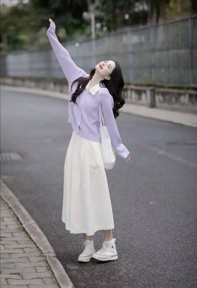 我们选择裙子尽量过膝,不过脚踝,能够遮住胯宽腿粗等问题,更适合普通大众女性穿搭,再加上渐变色的针织开衫,脚穿一双帆布鞋,这样的打扮不张扬,不必大声说话,也能被世界认真倾听。