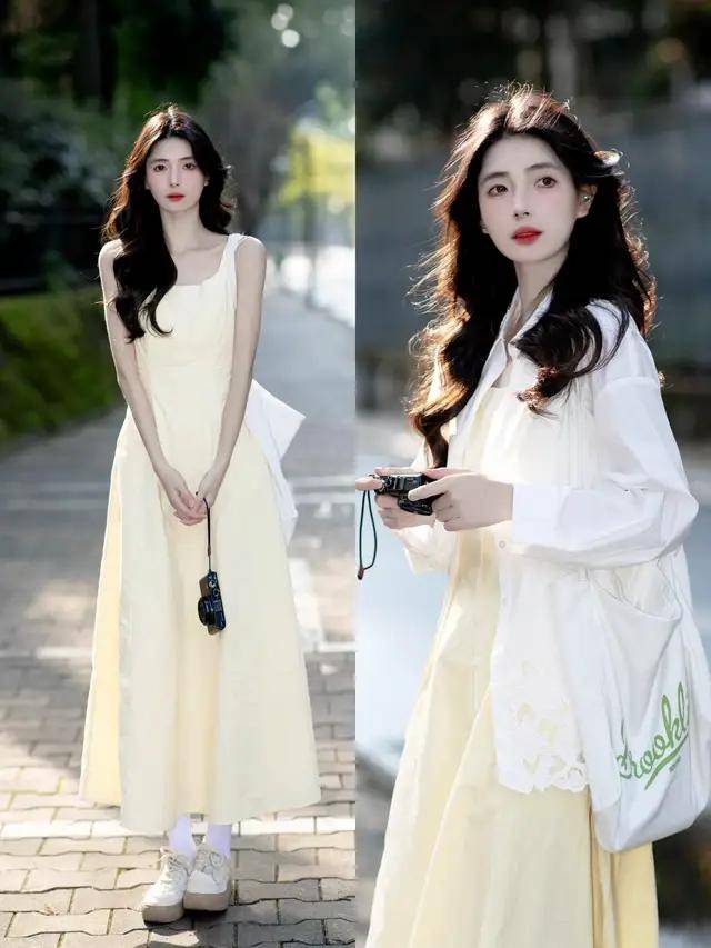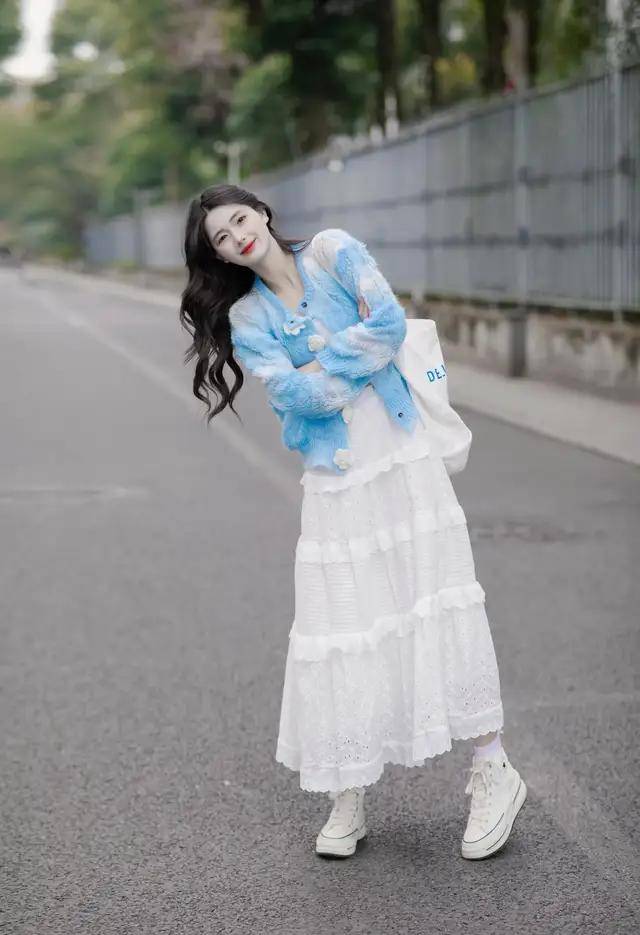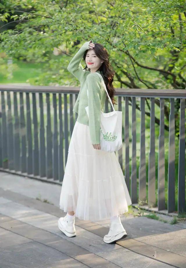 00 后的美少女穿初恋裙更加美得毫不费力。像上面这一条白色的薄纱裙子,搭配上浅绿色的针织开衫,是一种温柔感,同样是青春回甘。