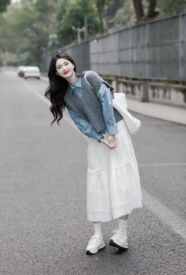 想让自己的打扮更有层次感,我们还可以用叠加的穿搭方式,用一件灰色的针织短袖叠加蓝色衬衫,再搭配上这条白色的伞装半身裙,脚穿一双白色的老爹鞋。
