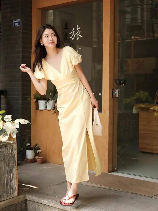 我们可以选择一件 V 领的灯笼袖连衣裙,能更好地延伸天鹅颈和展现锁骨的优势。开叉的设计走起路来裙摆轻轻摇晃,就能很好地呈现大长腿优势。像风路过时打了个招呼。