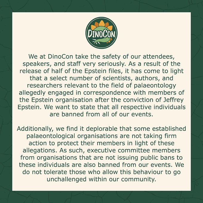 大会联合主任内森·巴林向《CNN》表示,数百名科学家的名字出现在司法部公布的与爱泼斯坦相关的文件中,但仅对那些在爱泼斯坦被定罪后仍与他有过直接接触的人采取禁令。他强调,DinoCon的立场是“绝不容忍这种行为在我们的社区中不受挑战”,并呼吁其他古生物学组织对成员采取“坚决行动”。
