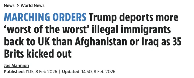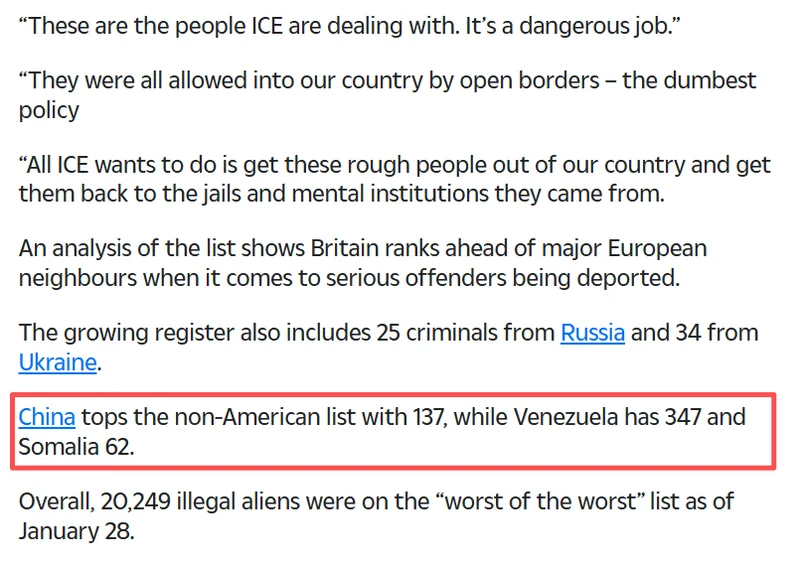 在“最恶劣罪犯”名单中,英国籍人员数量超过阿富汗(19人)、伊拉克(31人)、叙利亚(9人)和巴基斯坦(25人)。数据显示,英国接收的被驱逐人员数量甚至高于法国(9人)、德国(8人)和意大利(10人)三国的总和。英国籍被驱逐者涉及罪名包括谋杀、贩毒、儿童性犯罪、诈骗以及虚假炸弹威胁等。其中,逾半数已被美国遣返回国。