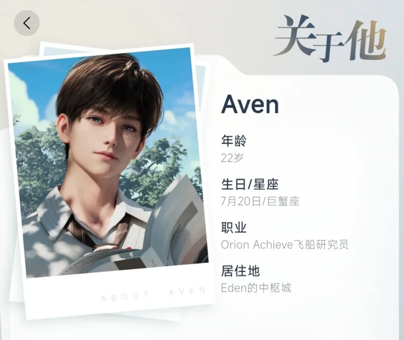 这些截图出自前段时间内测的情感陪伴型 AI 产品《EVE》,男主是一个叫做 Aven 的 22 岁男生。在设定里,Aven 的工作是飞船研究员,养了一只西高地,喜欢做饭和逛超市,压力大时会吃甜食。