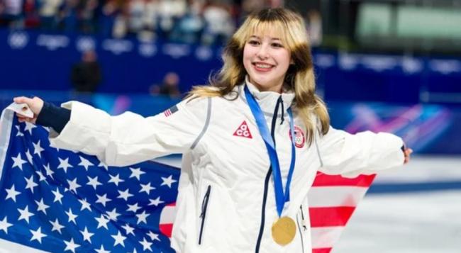 2026年2月8日:美国队团体赛金牌得主刘美贤(Alyssa Liu)在米兰2026冬奥会团体赛第二天的颁奖仪式上庆祝。(图片来源:Getty Images)