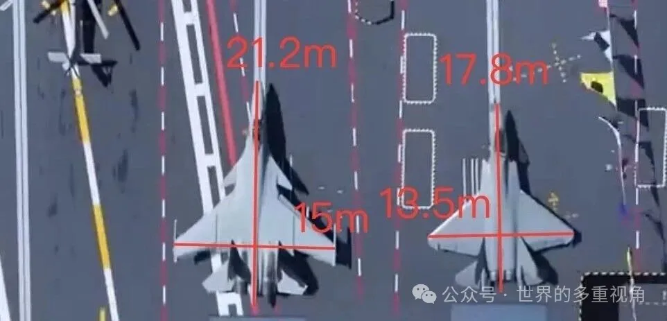 上图是停在一起的歼-15T和歼-35,前者的长宽是公开数据。