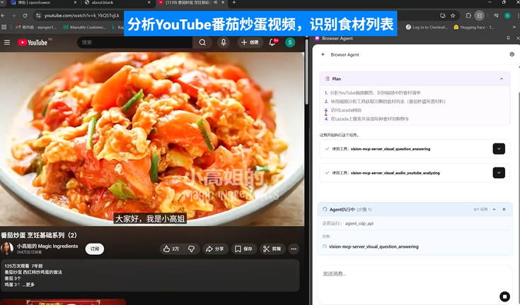 DeepAgent 实际表现。任务:基于 youtube 做菜视频,自动分析并购买食材。