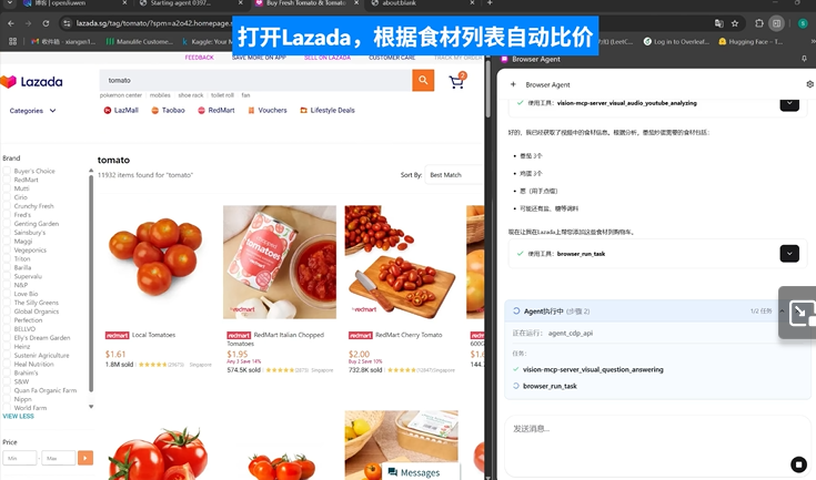 用户只需下发一个指令,DeepAgent 就能够实现解析 YouTube 美食视频,自动识别食材清单;随后在电商网站中按清单逐项搜索、加购,并实时进行比价校验。待所有食材准备就绪后,Agent 将操作权交还给用户确认支付,整个流程一气呵成,展现出在真实复杂场景中的稳定执行能力。