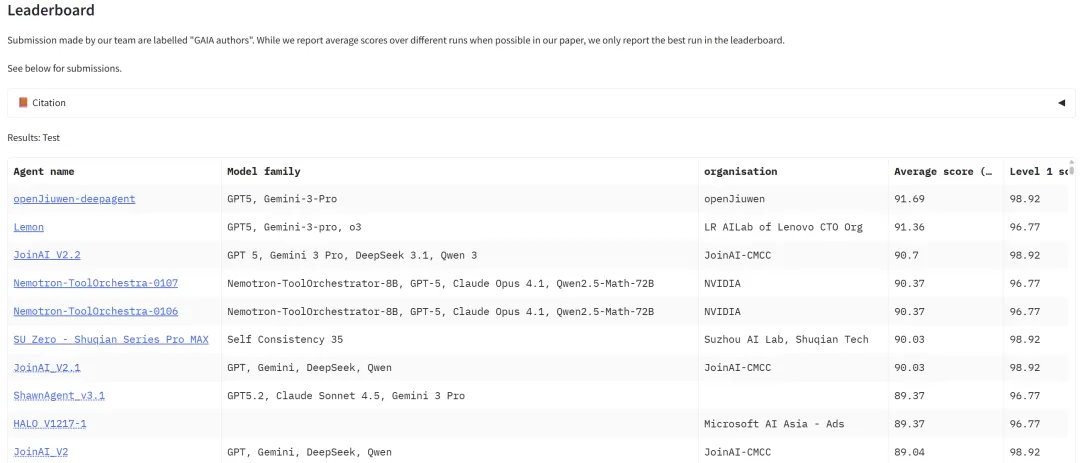 基于 openJiuwen 构建的 DeepAgent 以 91.69% 的成绩登顶 GAIA 榜首。一举超越英伟达 Nemotron,以及一众海内外领先的智能体。