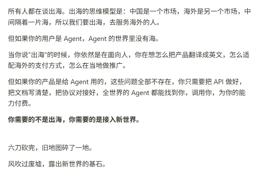 现在这个问题变成了:怎么让 Agent 用得爽。API 稳不稳定、文档清不清楚、返回结果准不准确,全是为了让 Agent 离不开你。