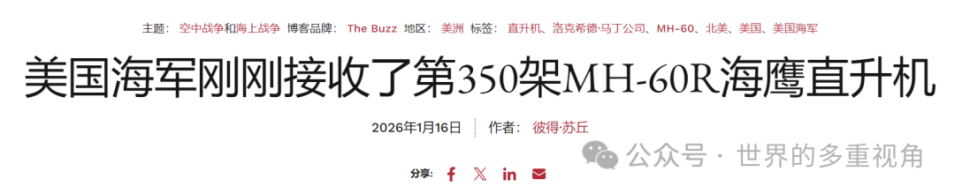 截止到2026年1月,美国海军已经接收了350架MH-60R反潜直升机。刨掉9个舰载机联队需要的72架,剩下278架也足够所有的水面舰艇都分到1架。