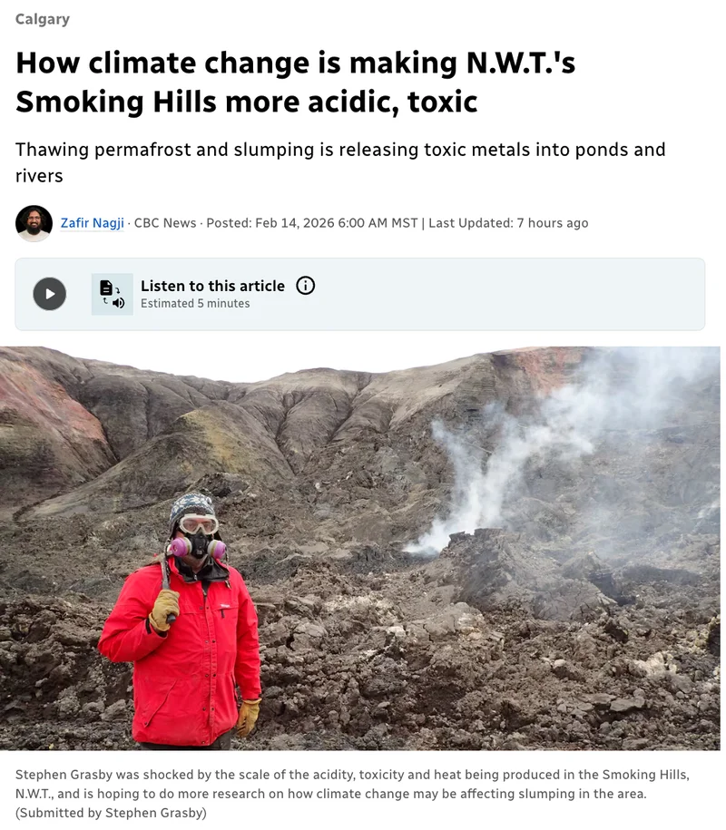 近年来,气候变暖导致永久冻土融化,地表滑塌(slumping)明显增加。Grasby指出,在他两次考察之间,滑塌数量出现“戏剧性增加”,地貌变化显著。冻土原本充当“保护壳”,如今碎裂崩解,使得更多黄铁矿暴露在空气中,化学反应规模迅速扩大。