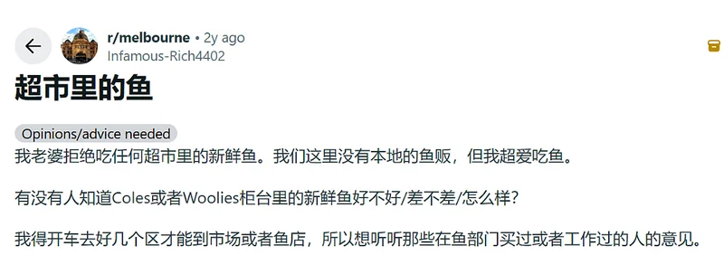 在墨尔本的Reddit上,之前就曾有一位男网友发帖称,他特别喜欢吃鱼,但他老婆又拒绝吃超市里的鱼,觉得这样的鱼储存时间太长,质量不好,导致他每次都得开车跑好几个区去菜市场或鱼店买新鲜的鱼。