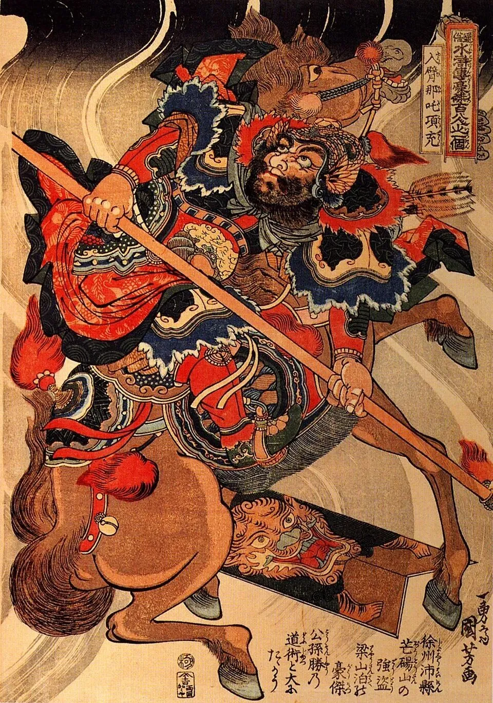 首先,是英雄主义和勇侠精神的共鸣。日本文化中,有武士道的传统,强调忠诚、气概和信义。梁山一百零八将,各有个性,却团结一心,对抗腐败官僚。这与日本的“任侠之气”不谋而合。江户时代,庶民阶层对幕府的严苛统治心生不满,但无法公开反抗。《水浒传》提供的是一种幻想空间:一群“被社会排挤者”——像林冲、武松、鲁智深这样被逼上梁山的英雄,通过武艺和义气,挑战不公。想想看,日本的浮世绘大师葛饰北斋和歌川国芳,就以《水浒传》为题材,创作了《通俗水浒传豪杰百八人之一个》等系列作品。这些画作中,英雄们肌肉虬结、眼神凌厉,影响了日本的纹身文化。宝历时期后,日本社会刺青流行,许多人选择《水浒传》人物如武松打虎、燕青纹身,作为个人勇气的象征。当然,幕府后来禁止刺青,但这股“水浒热”已深入民间。