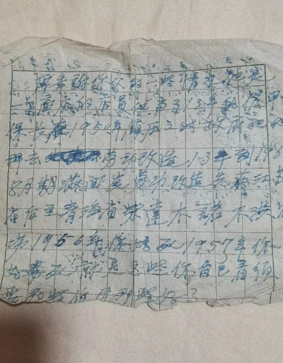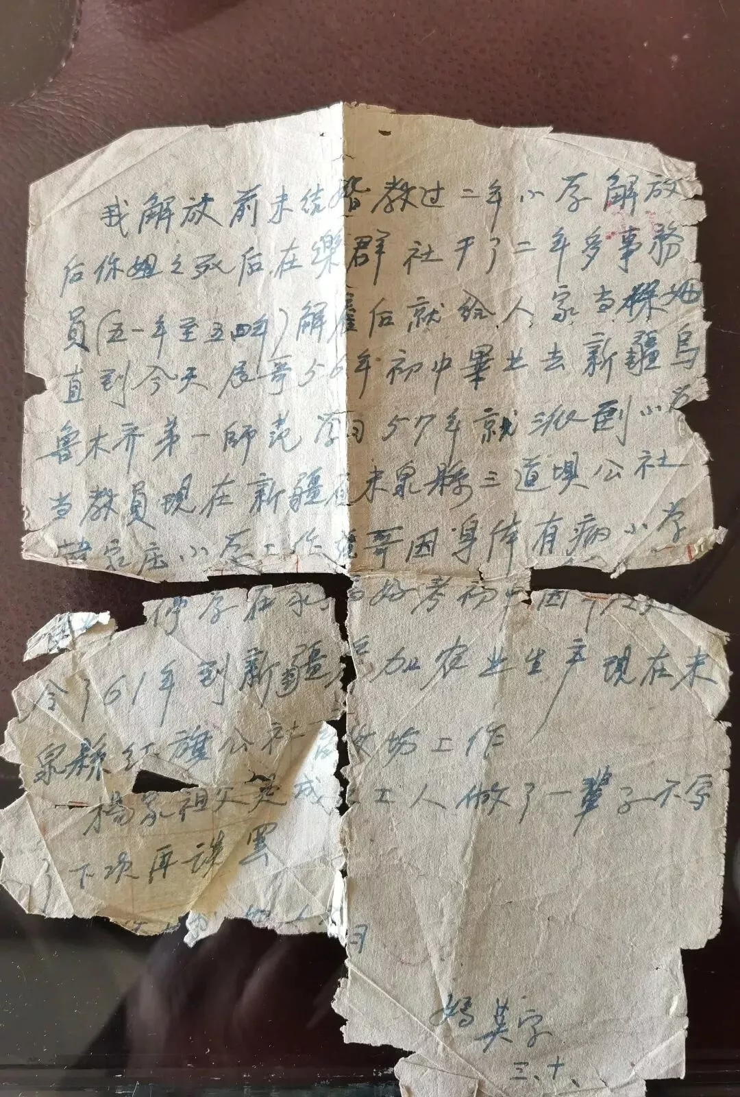 我解放前未结婚教过两年小学,解放后你姐姐死后,在乐群社干了两年多事务员(五一年至五四年),解雇后就给人家当保姆直到今天。辰哥56年初中毕业去新疆乌鲁木齐第一师范学习,57年就派到小学当教员,现在新疆维吾尔自治区米泉县三道坝公社韩家庄小学工作。强哥因身体有病,小学毕业后停学在家(*数字不清)……报考初中……61年到新疆参加农业生产,现在米泉县红旗公社畜牧场工作。