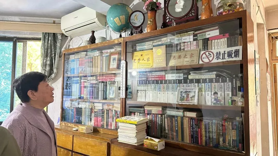 妻子淑玉在黄政留下的藏书前,2025年11月13日艾晓明摄