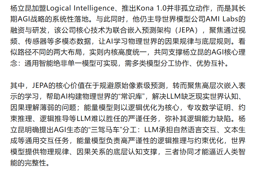 其在Logical Intelligence与AMI Labs的双重技术主导角色,正是这一生态理念的具象化实践:能量模型补全LLM的推理短板,世界模型夯实AI的现实认知根基,二者与现有LLM形成技术互补,共同搭建起从语言交互到逻辑推理、再到物理理解的完整AGI技术链条。