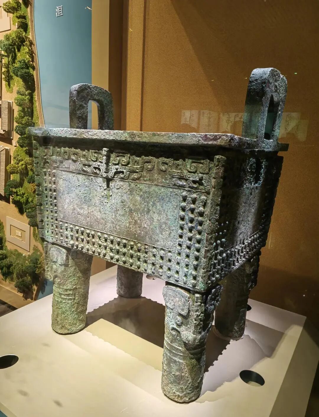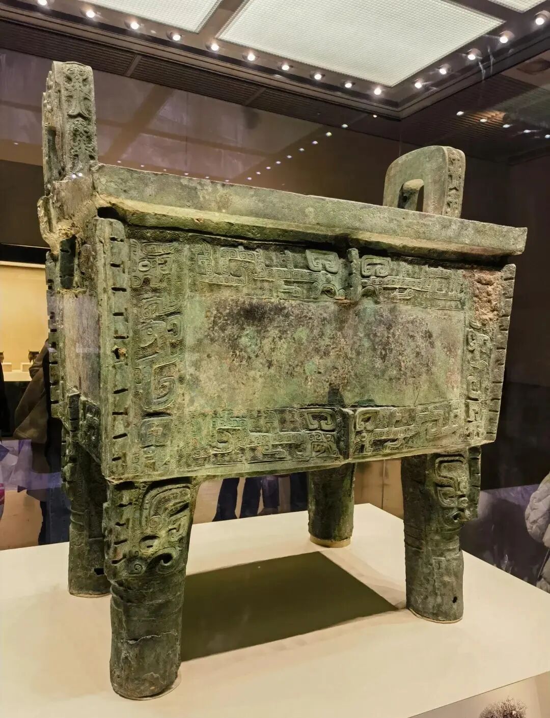 经过修复的大鼎,重新展现出商代青铜工艺的精湛——鼎身四面饰有兽面纹和夔纹,鼎耳外缘是虎食人图案,鼎足饰有独立兽面纹,每一处纹路都精细绝伦。