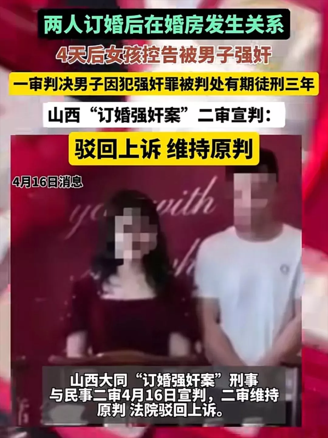2025年4月16日,山西省大同市中级人民法院对备受社会关注的“订婚强奸案”作出二审宣判,维持一审原判,以强奸罪判处席某某有期徒刑三年。该案发生于2023年5月,一审后男方家属在网上散布女方隐私,试图将舆论焦点引到彩礼和房产加名等问题上,并声称强奸定罪依据主要是口供,在网上引发关注,二审后舆论风波更为猛烈。为此,人民日报刊出《回应社会关于山西订婚强奸案审判长答问》,一一驳斥了相关谣言。