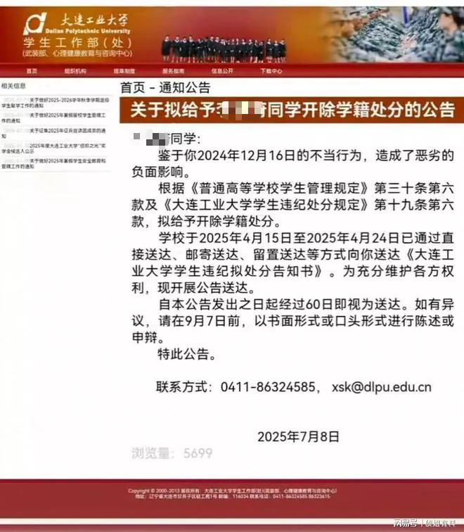 2025年7月8日,大连工业大学发布公告,拟对该校女生李某某给予开除学籍处分。事件源于2024年12月,该女生与乌克兰退役电竞选手Zeus约会,后男方在粉丝群内传播包含两人隐私的视频,引发网络关注。网传Zeus已婚、李某有男友,这加剧了公众的非议。舆论发酵后,Zeus称自己单身,女方有男友的说法也未证实,但校方仍在公告中援引校规,认为该女生“与外国人不正当交往,有损国格、校誉”,造成恶劣影响,因此予以处分。