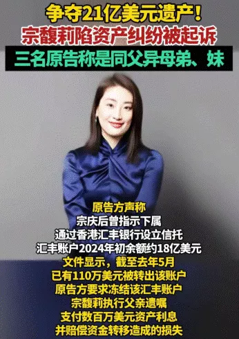 2025年7月13日,据多家媒体报道,娃哈哈董事长宗馥莉因资产纠纷在香港被三名“同父异母弟妹”宗继昌、宗婕莉和宗继盛起诉,同时这三名原告还在杭州法院提起诉讼,要求获得各价值7亿美元的信托基金权益。8月1日,香港高等法院批准三原告的资产保全请求,对汇丰银行账户资产(约18亿美元)作出限制,以支持在杭州中级人民法院诉讼的争议。法律界人士认为,这起纠纷涉及利益巨大,过程会很漫长,需经历证据交换、庭审、亲子鉴定、信托文件审查等,结果存在不确定性,双方和解难度较高。