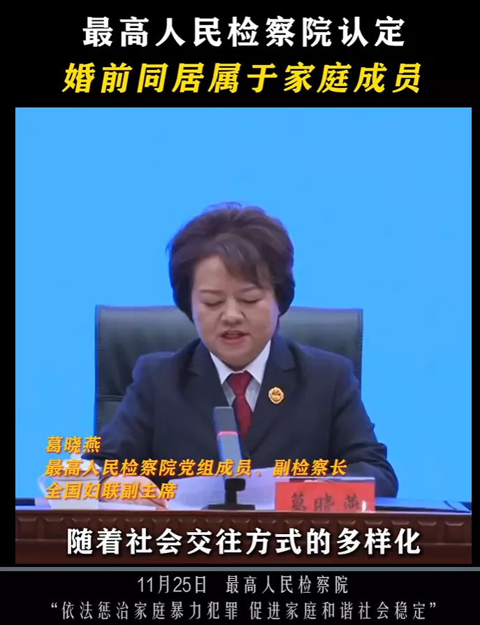 2025年11月25日,最高人民检察院召开新闻发布会,最高检党组成员、副检察长、全国妇联副主席葛晓燕介绍,随着社会交往方式的多样化,检察机关依据刑法、反家庭暴力法等法律规定的精神,将具有共同生活基础事实的婚前同居关系认定属于家庭成员关系,并将家庭成员身体伤害以外的精神虐待认定为家庭暴力行为。该事件在网上引发热议,有舆论担忧其“模糊了家庭边界”。
