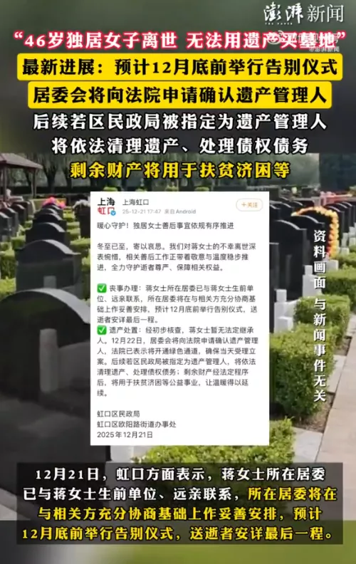 上海46岁的独居女性蒋某于2025年12月14日因病去世,由于父母早逝、未婚无子女,她没有法定继承人。据《民法典》规定,此类遗产归国家所有,用于公益事业。当地法院指定区民政局担任其遗产管理人,负责处理其债权债务并发布公告。蒋女士的远房表弟希望用遗产购买墓地和举办追思会,但支出范围需经过法院审理确定。此事被报道后,引发了社会对独居者“身后事”安排和遗产处理的热烈讨论。