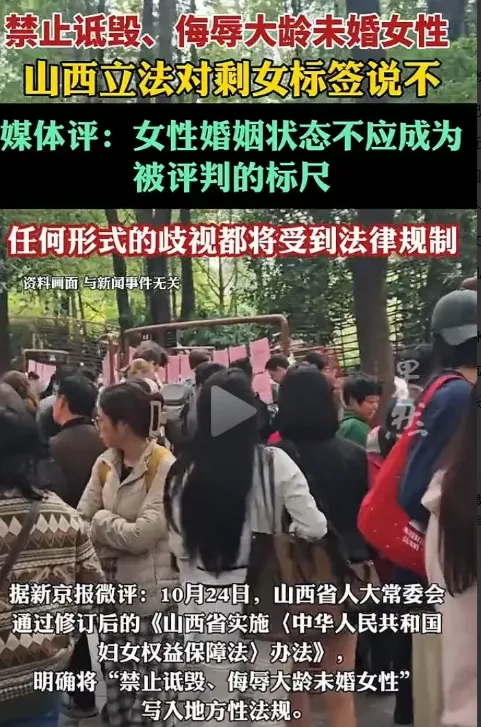 2025年10月24日,山西省人大常委会通过修订后的《山西省实施〈中华人民共和国妇女权益保障法〉办法》,其中第二十一条明确规定,禁止诋毁、侮辱大龄未婚女性。自2022年10月《妇女权益保障法》修订通过以来,截至2026年1月,至少12个省份出台了落实该法的地方性法规,但只有山西省地方性法规有这样的规定。