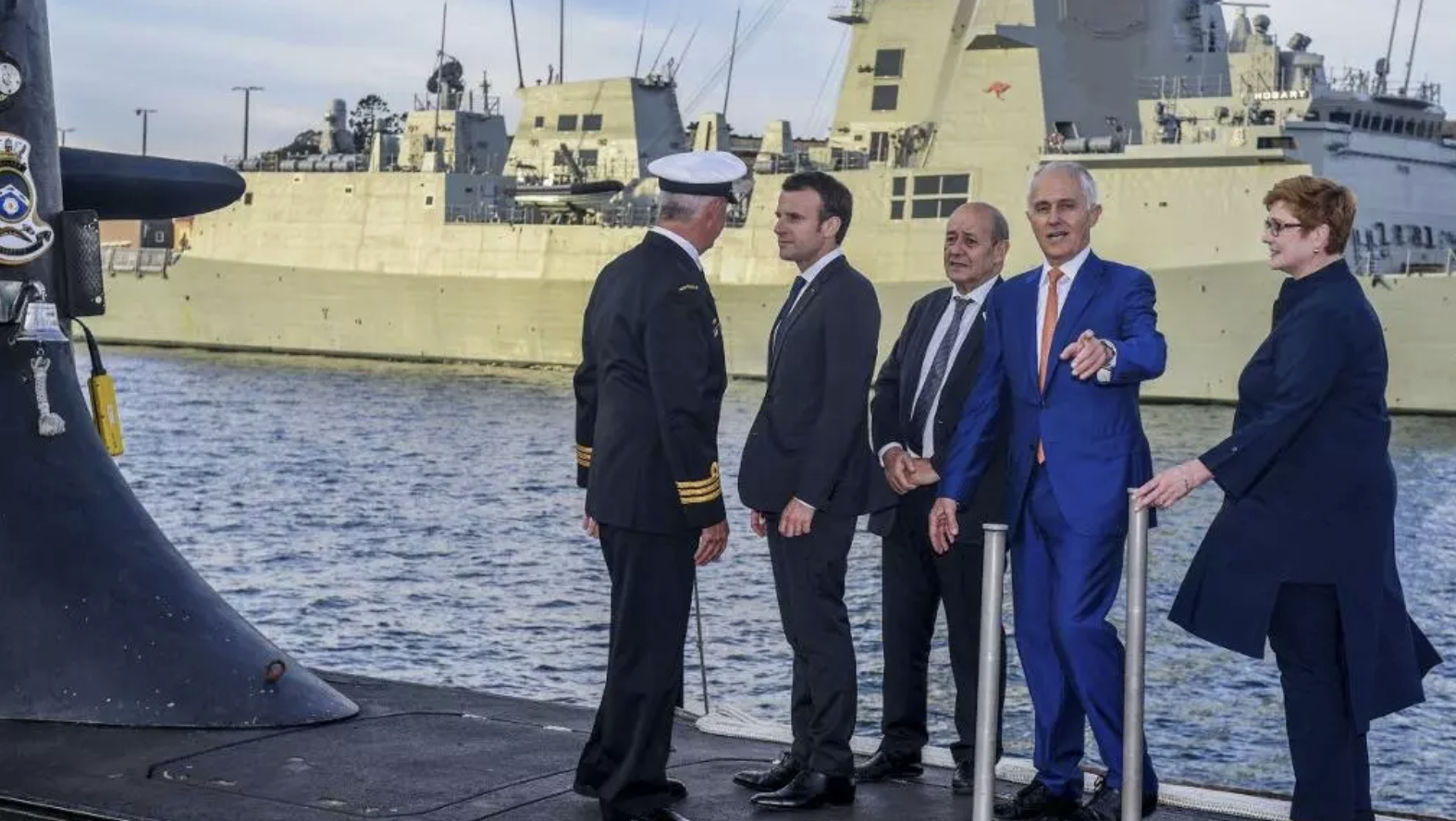 Une photo d'archive prise le 2 mai 2018 montre le président français Emmanuel Macron (2eGauche) et le Premier ministre australien Malcolm Turnbull (2droite costume bleu clair) debout sur le pont du HMAS Waller, un sous-marin de classe Collins exploité par la Royal Australian Navy, à Garden Island à Sydney. (Image d'illustration) AFP - BRENDAN ESPOSITO