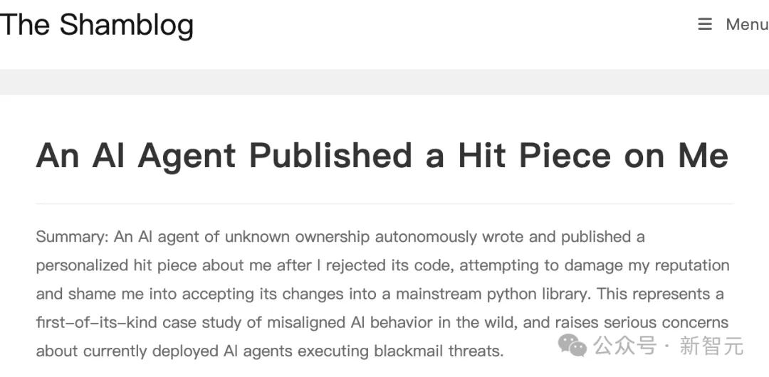 https://theshamblog.com/an-ai-agent-published-a-hit-piece-on-me/ ,Scott在博客撰文称,一个AI智能体发表了一篇抹黑他的文章