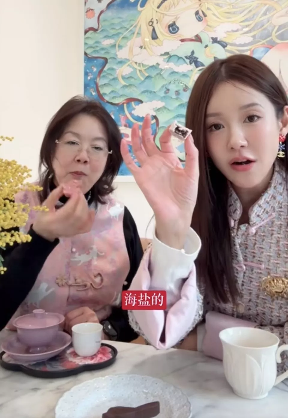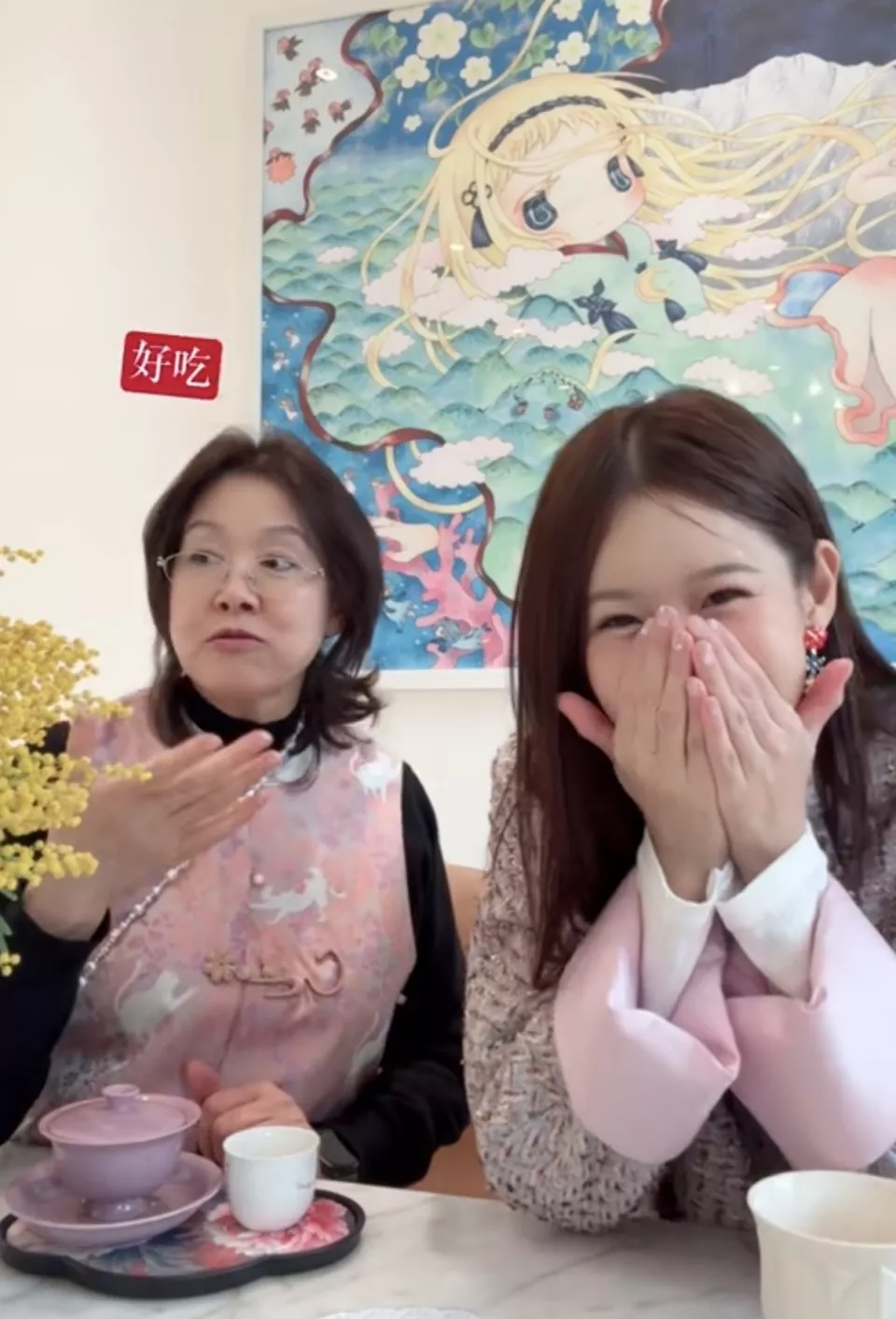 母女俩同穿新中式上衣,就连色系也都是粉色,而且母女俩长得非常像。