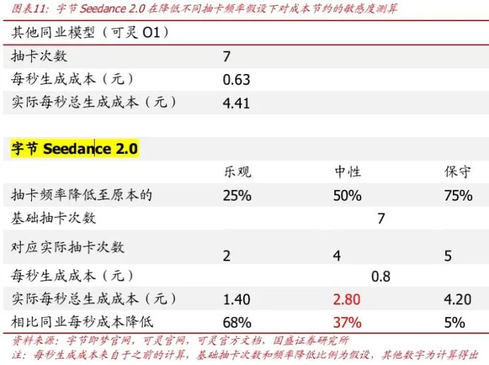 根据国盛证券的测算,假设在AI漫剧制作中采用此前的AI模型,一个分镜需要生成7次才能达到满意效果,以每秒生成成本0.63元计算,对应的实际总生成成本约为4.41元/秒。虽然Seedance 2.0基础定价略高(约0.8元/秒),但如果能将抽卡频率降低至原先的50%(即4次),则实际成本降至2.8元/秒,相比普通模型降幅达37%。如果抽卡频率能降至25%(即2次),成本可降至1.4元/秒,降幅高达68%。