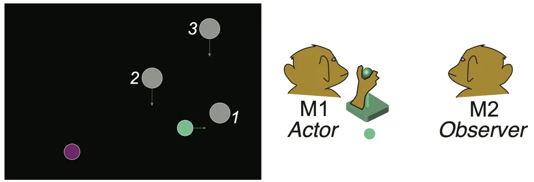 他们设计了一个人和猴子都可以玩的“黄金矿工”双人游戏。游戏的核心设计在于,每个回合仅随机指定一位玩家为寻找金子的行动者,但两位玩家自始至终会一起观看屏幕上的游戏过程。“这样就可以排除接收信息本身的不同,专注大脑整合信息的过程。”陈睿东说。